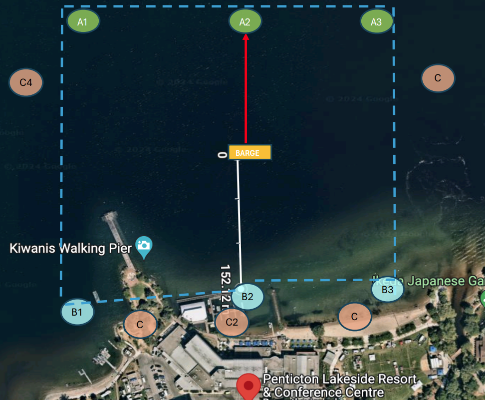 All outdoor washroom facilities will be open and serviced until midnight. Be aware that boaters on Okanagan Lake will not be allowed to enter the designated safety zone marked around the barge on the water, as shown in the map below.